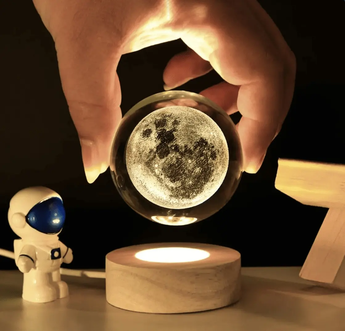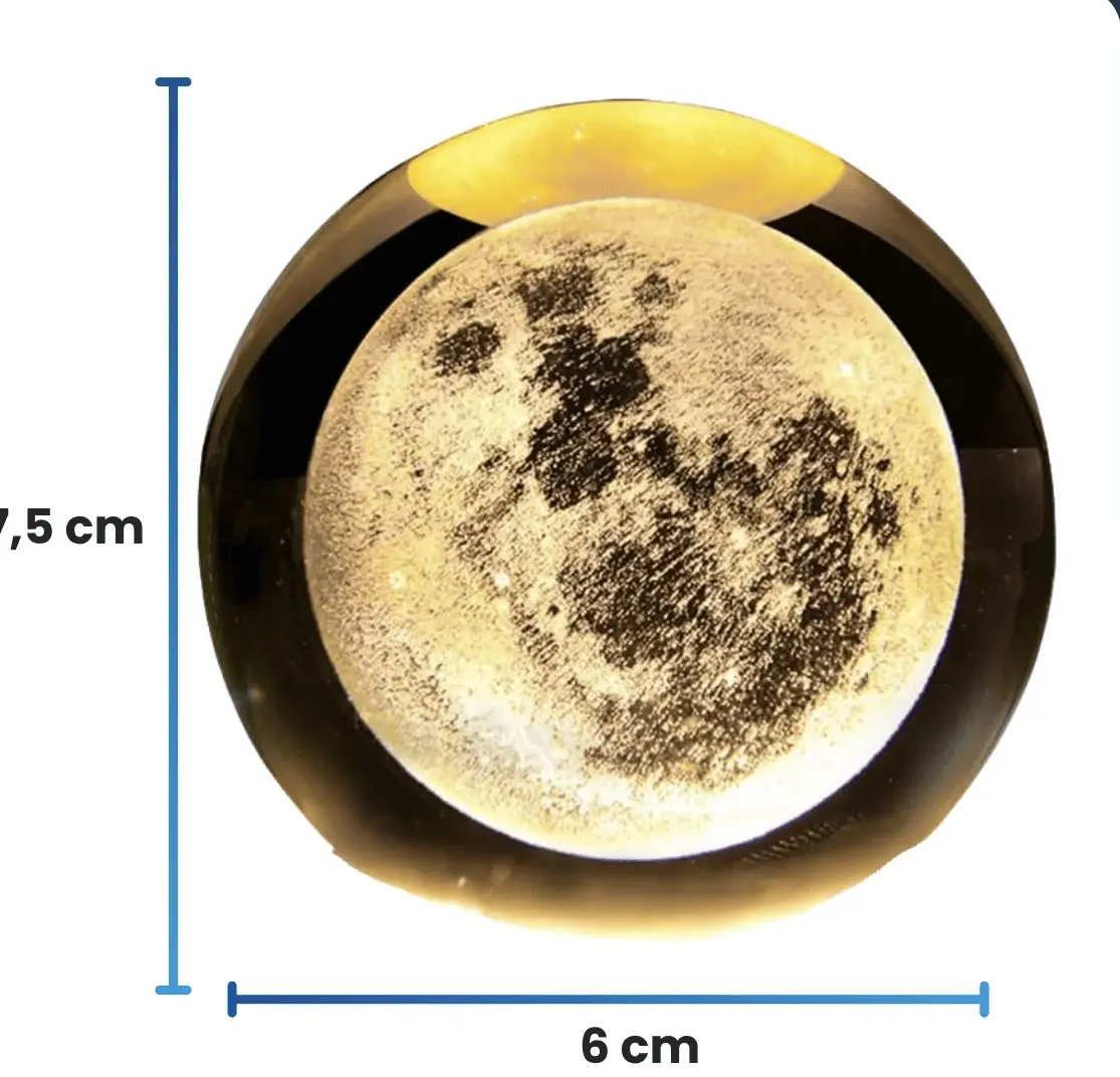 Grabado Láser 3D de Precisión: La esfera de cristal alberga en su interior una luna llena increíblemente detallada en 3D, grabada con tecnología láser avanzada. 🌟 ¡Es como tener una pequeña luna flotando en tu habitación!