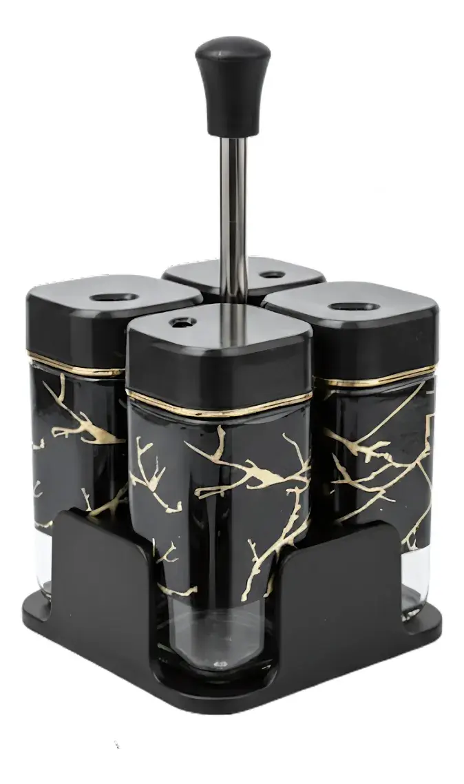 • Set Completo y Organizado: Incluye 4 frascos cuadrados perfectos para tus especias favoritas, junto con una base contenedora que los mantiene agrupados y estéticos en la mesada.