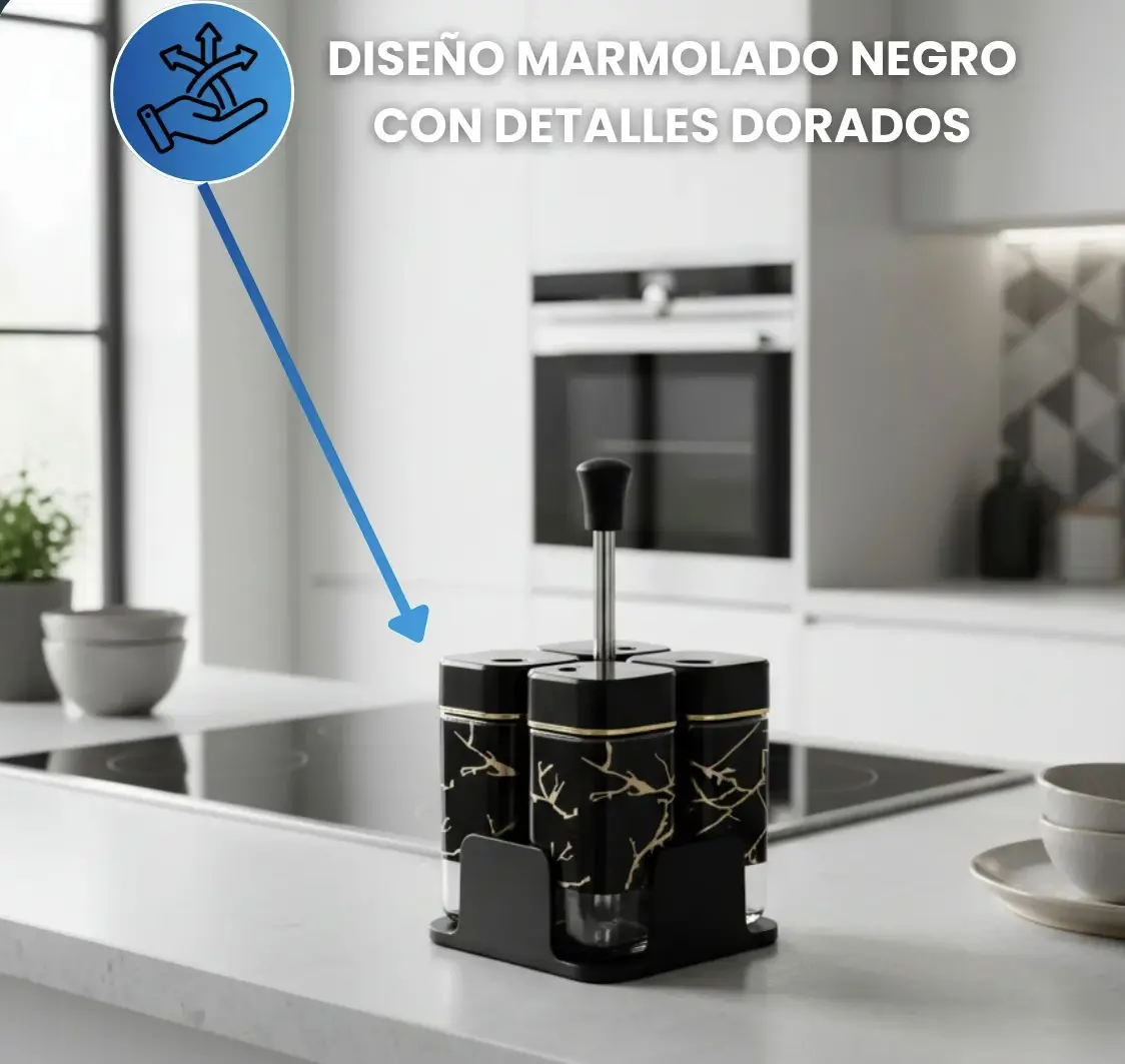 Dale a tu cocina el toque de distinción y orden que se merece. Este elegante set especiero cuadrado combina la durabilidad del acero inoxidable y el vidrio con un sofisticado diseño efecto mármol negro y detalles dorados. No es solo un organizador; es una pieza de decoración moderna que mantendrá tus condimentos siempre frescos, a mano y con mucho estilo.